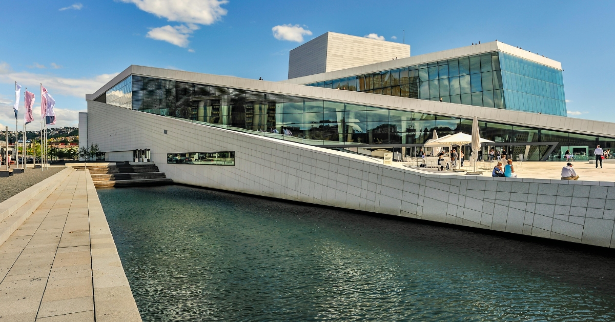 Exterior of the Oslo Opera House, a modern building with a white sloping roof that appears to rise from the water.